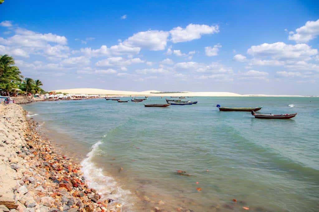 Barco no mar de Jericoacoara com areias brancas em volta da praia.