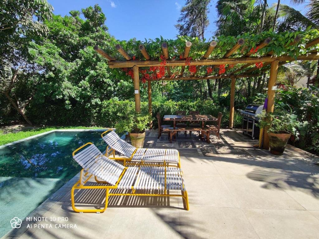 Piscina ao ar livre do Maresias Beach Housing durante o dia com piscina a frente e ao fundo várias cadeiras.