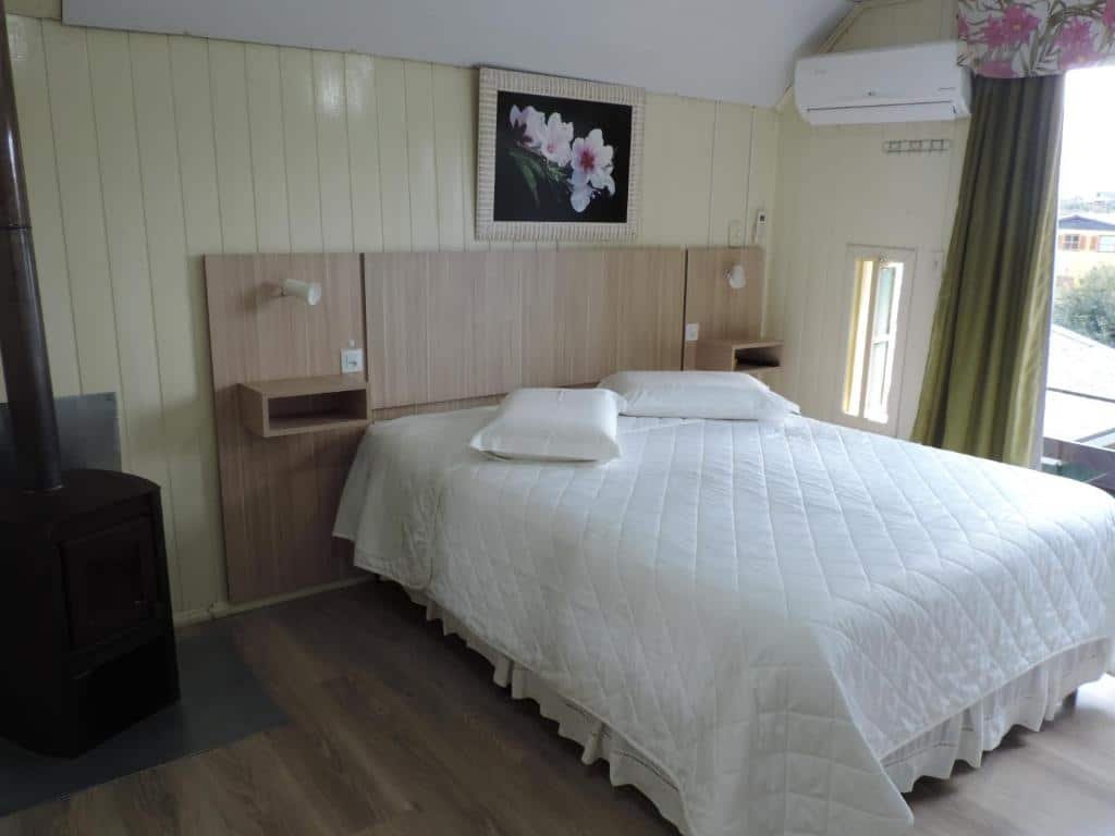 quarto do Central Chalés com uma lareira à direita e uma cama de casal simples à esquerda